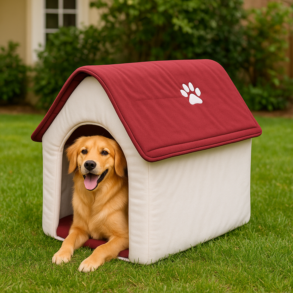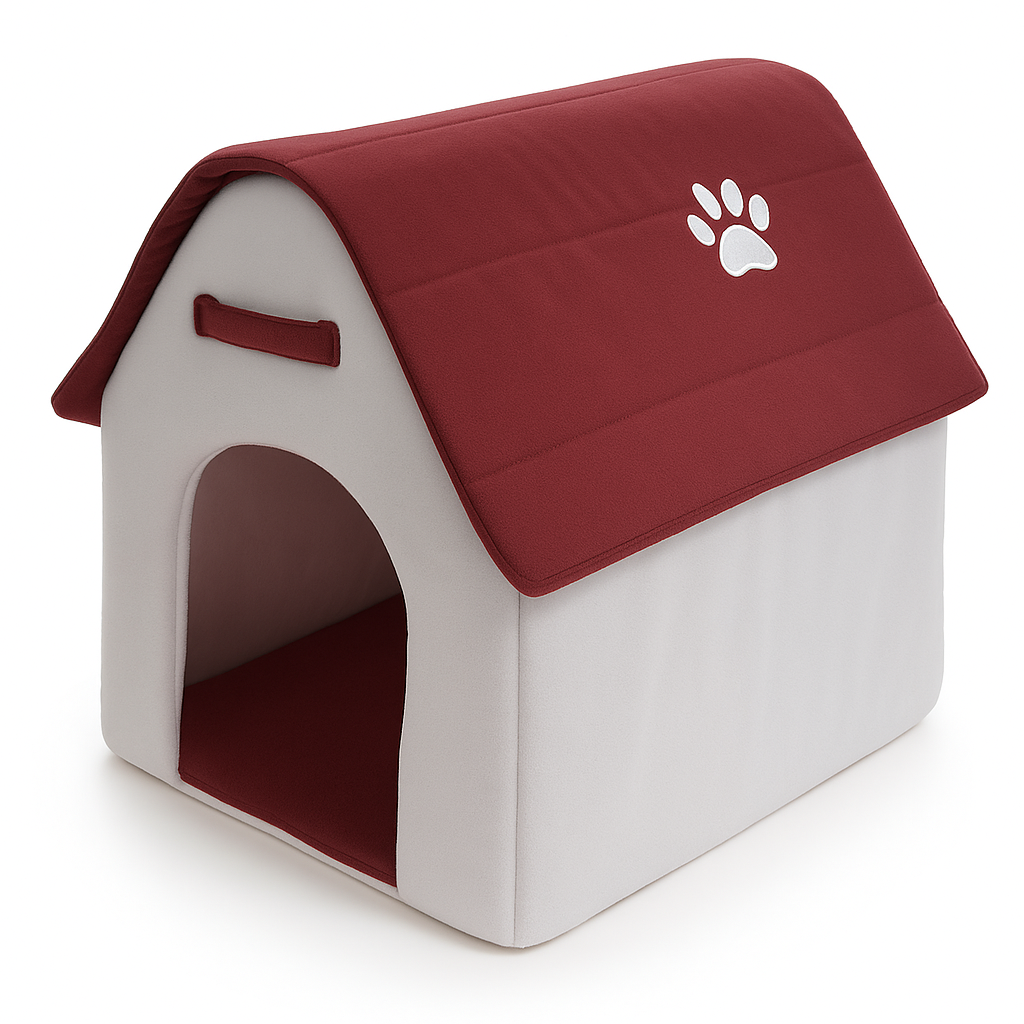 La Sweet Home es una encantadora casa para perros diseñada para ofrecerle a tu mascota un espacio propio lleno de comodidad, protección y estilo. Con un diseño tipo cabaña, esta casita combina una estructura firme y acolchada con un techo rojo vino decorado con una huella blanca, que le da un toque tierno y hogareño.